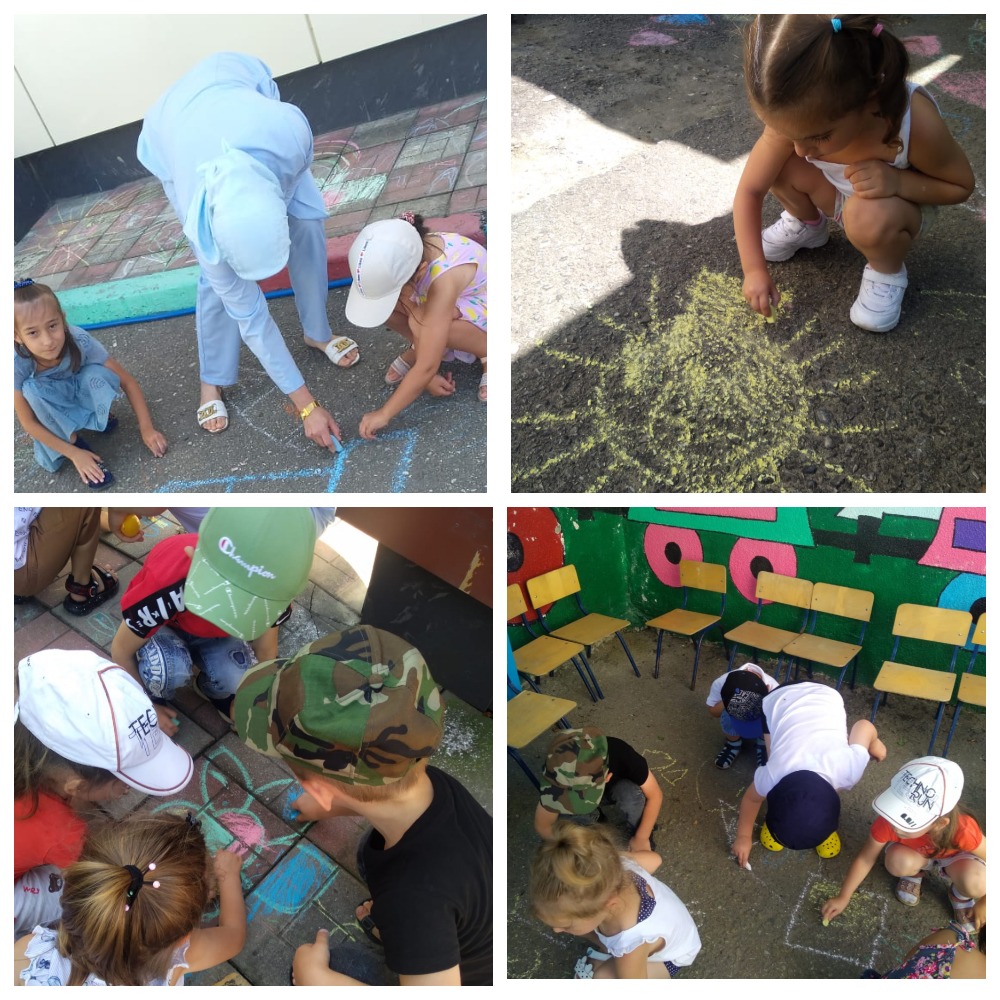 Воспитанники МБДОУ "Детский сад "Солнышко" с. Шатой, Шатойского муниципального района" рисуют мелками на асфальте.